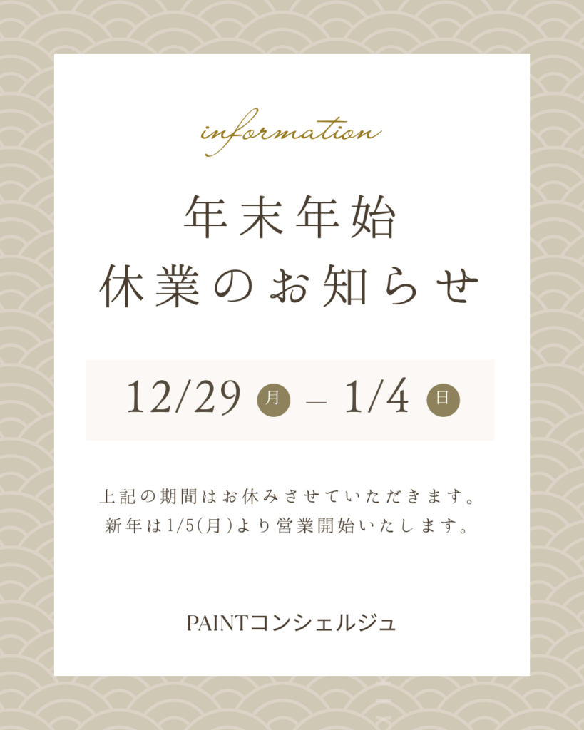 2025.12.25【年末年始休業日のお知らせ】🔹 休業期間12月29日(月)〜1月4日(日)🔹 年始営業開始1月5日(月)より通常営業いたします。誠に勝手ながら、年末年始は上記の期間を休業とさせていただきます。休業期間中にいただいたお問い合わせ・ご相談につきましては、営業開始日より順次ご対応させていただきます。ご不便をおかけいたしますが、何卒ご理解のほどよろしくお願いいたします。 冬の外壁塗装はできる?寒い時期の施工で気をつけること >︎